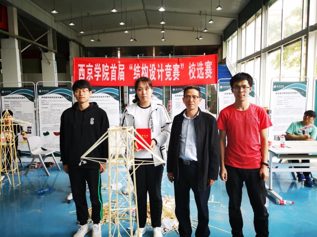 通过此次校赛,共有一组荣获一等奖,两组荣获二等奖,三组荣获三等奖,并在其中挑选一组荣获最佳创意奖。其中由薛亚杰带领的团队(高庆禹、张凯)以模型质量380g,承重荷载18kg夺得了本次大赛一等奖,张家明团队(李煜、房铭威)获得三等奖和最佳制作奖。最终选派薛亚杰、宋二胡、张家铭三名选手参加全国结构设计大赛陕西省赛。