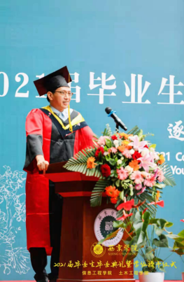 辅导员代表王宁老师发言,他说大学是一场不失约的相遇,毕业是一个崭新的开始。希望同学们以敢想、敢做、敢闯、敢拼的勇气,去享受追求梦想的过程,以梦为马,不负韶华,去续写西京人“挑战极限,追求卓越”的动人故事,去唱响属于他们自己的青春赞歌。