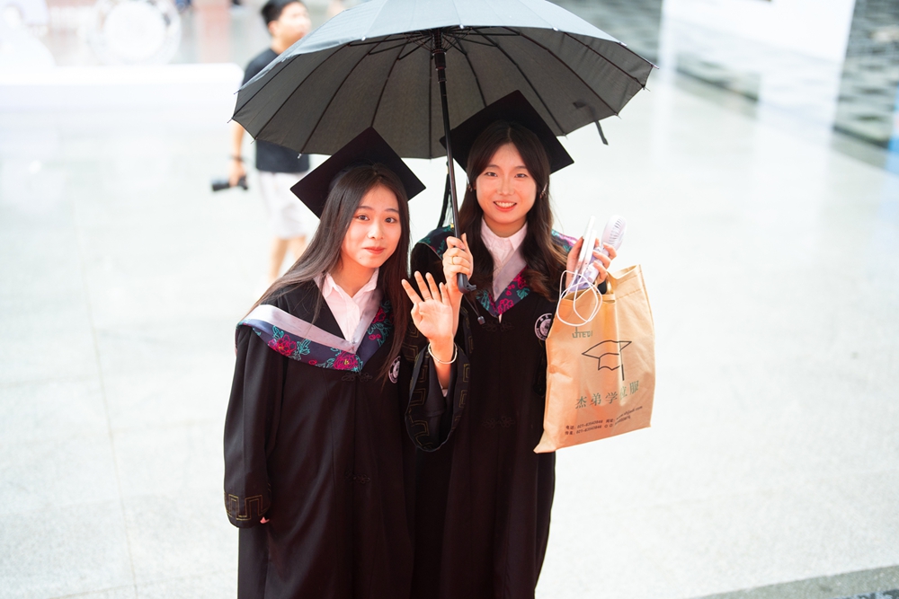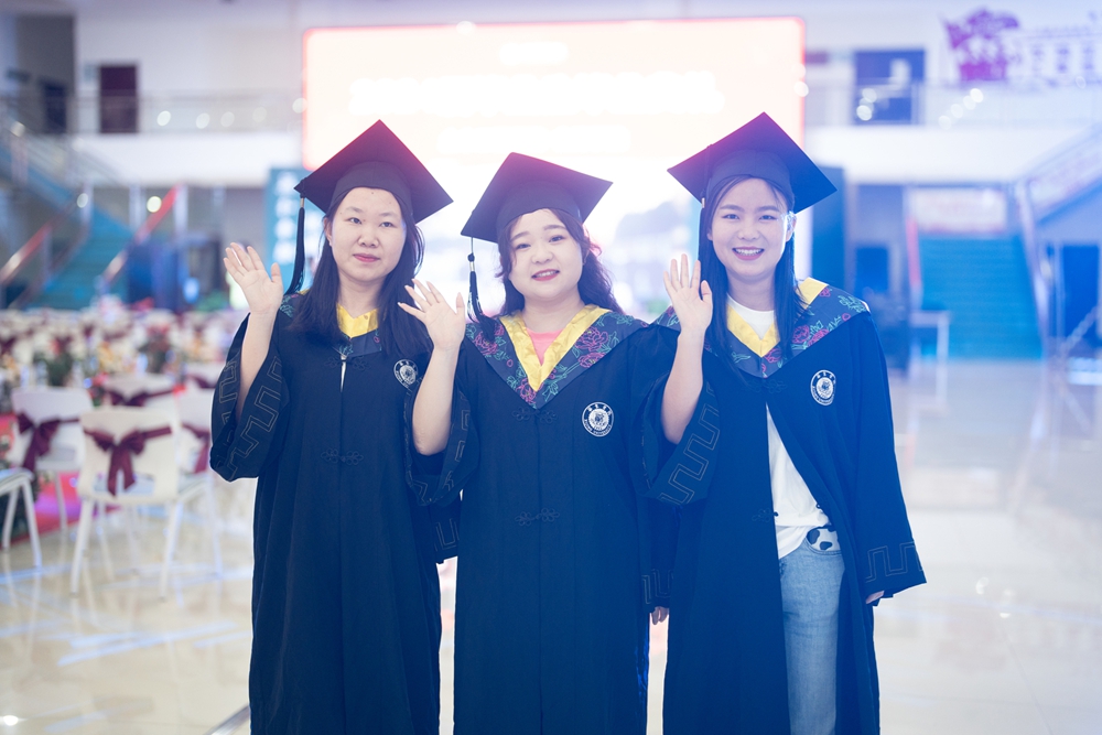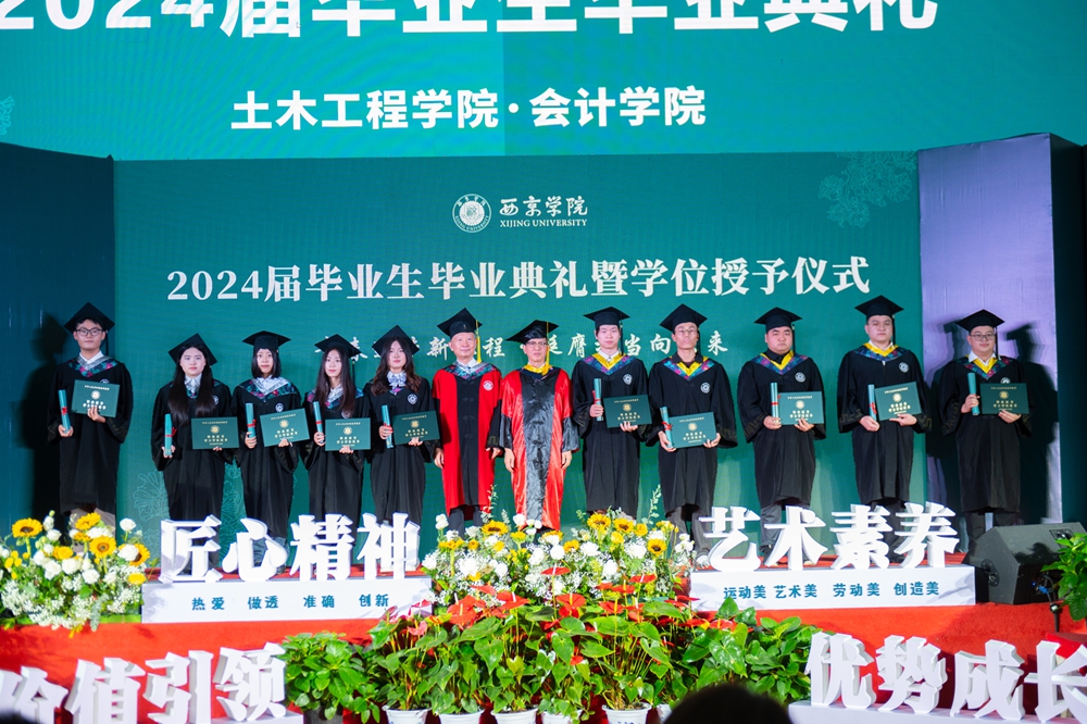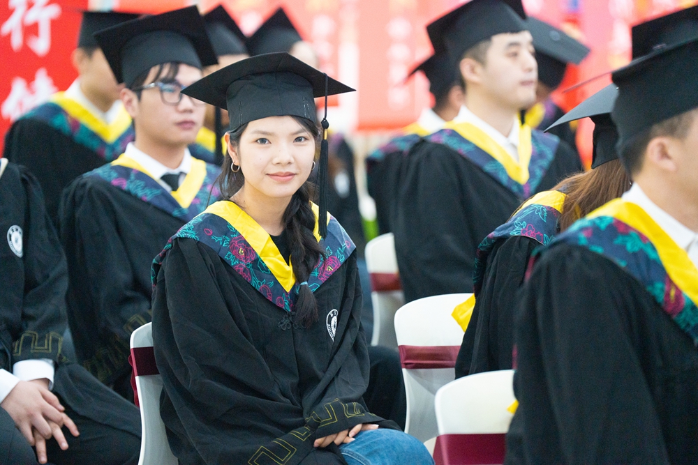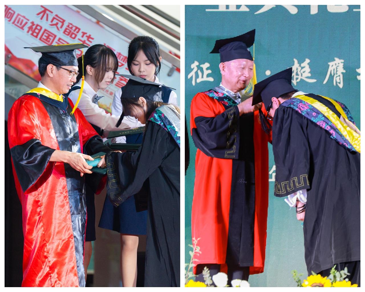 傅少君教授为毕业生颁发学士学位证书和校长寄语,王正斌教授为学士学位获得者扶正流苏。